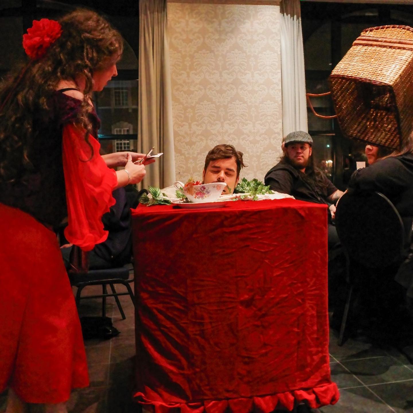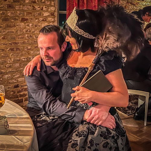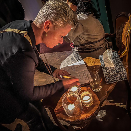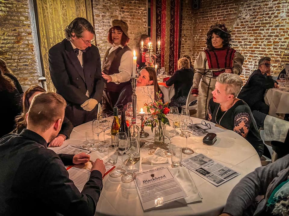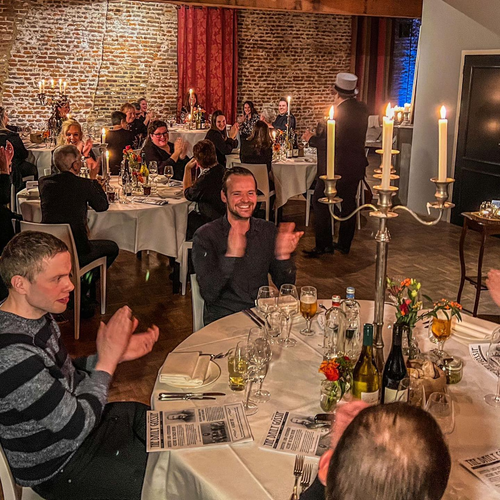 De zaal is ingedeeld in diverse sfeervolle gedekte tafels, waarbij elke tafel één team vertegenwoordigd. Aan het einde van de avond stellen we de vraag: wie heeft het gedaan en waarom heeft hij/zij het gedaan? De tafel met het juiste antwoord en de beste onderbouwing gaat naar huis met een ludieke prijs. Kortom, een bijzondere en onvergetelijke theatervorm voor max. 80 gasten per uitvoering, inclusief een ontvangstdrankje en heerlijk 3-gangendiner door onze chef Gunther Keulen.