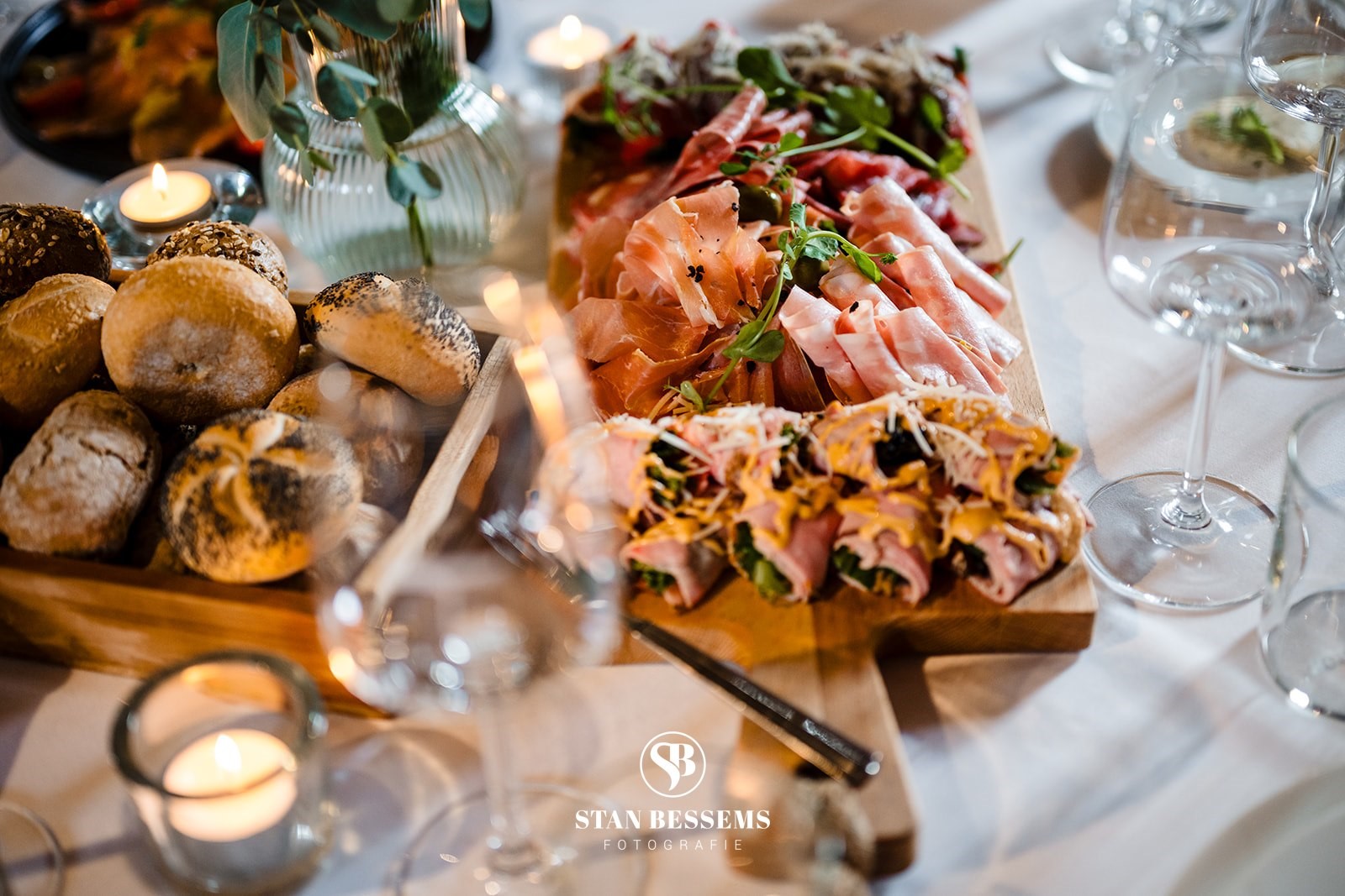 Wij reserveren een tafeltje bij ons Restaurant In Mensa en serveren een heerlijke borrelplank met kaas, worst, noten, olijven, brood, bitterballen en dips.
