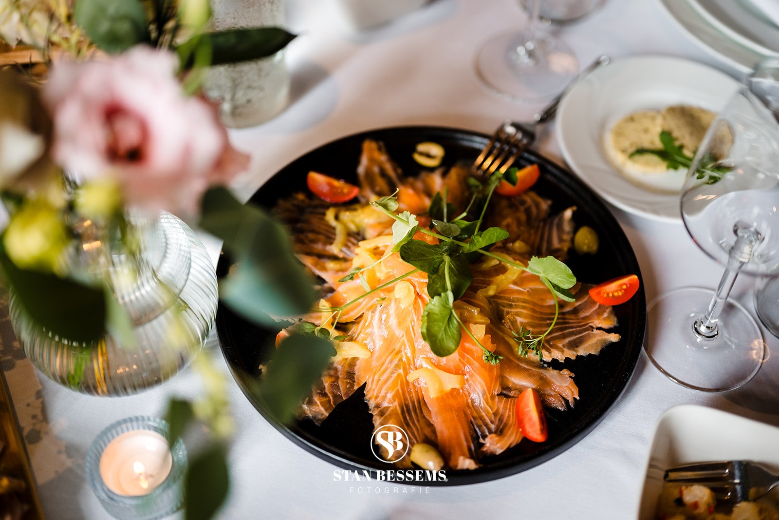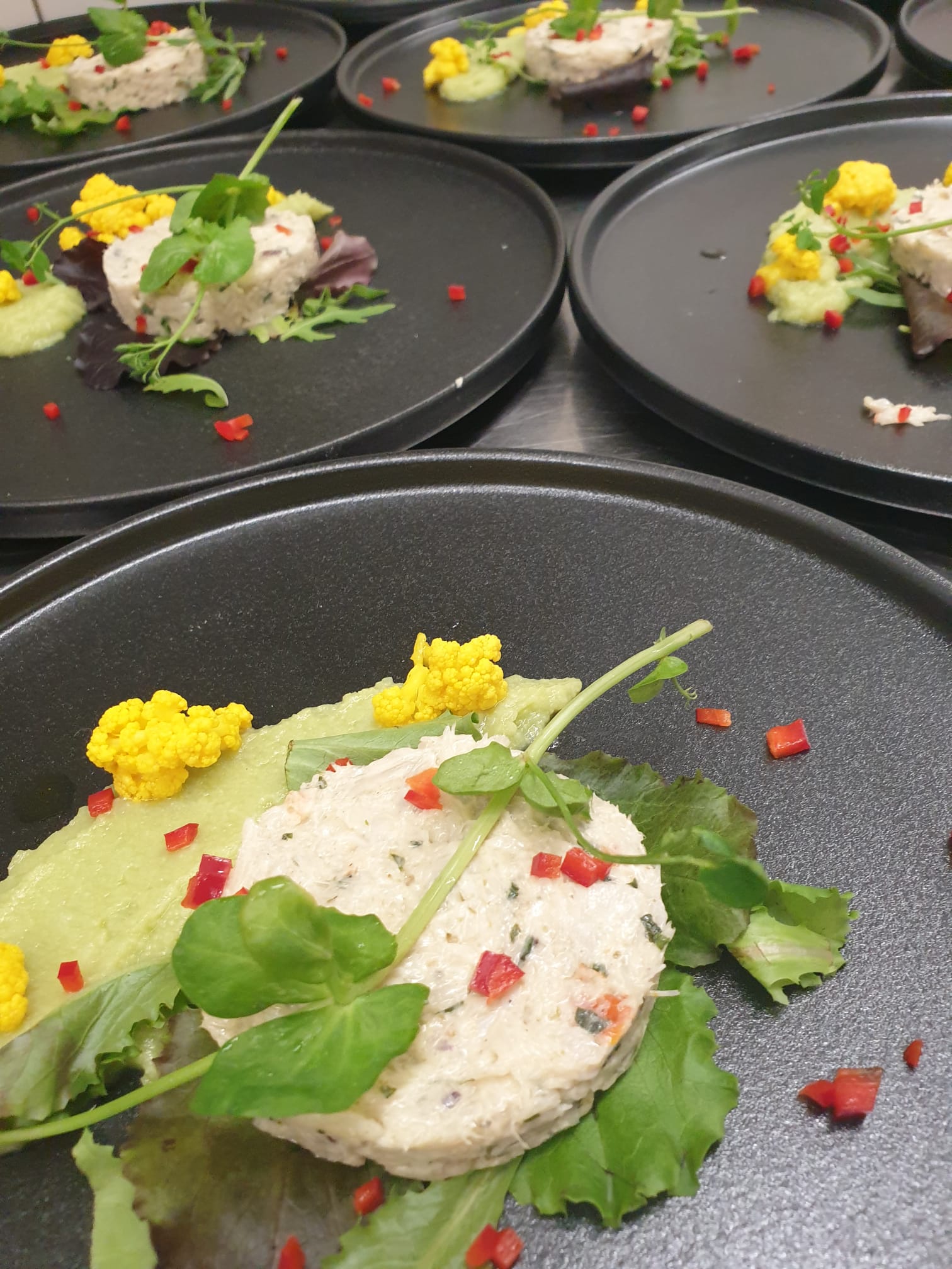 Huisgemaakte rollade van zalm met verse piccalilly en een mosterd/dillesaus.
